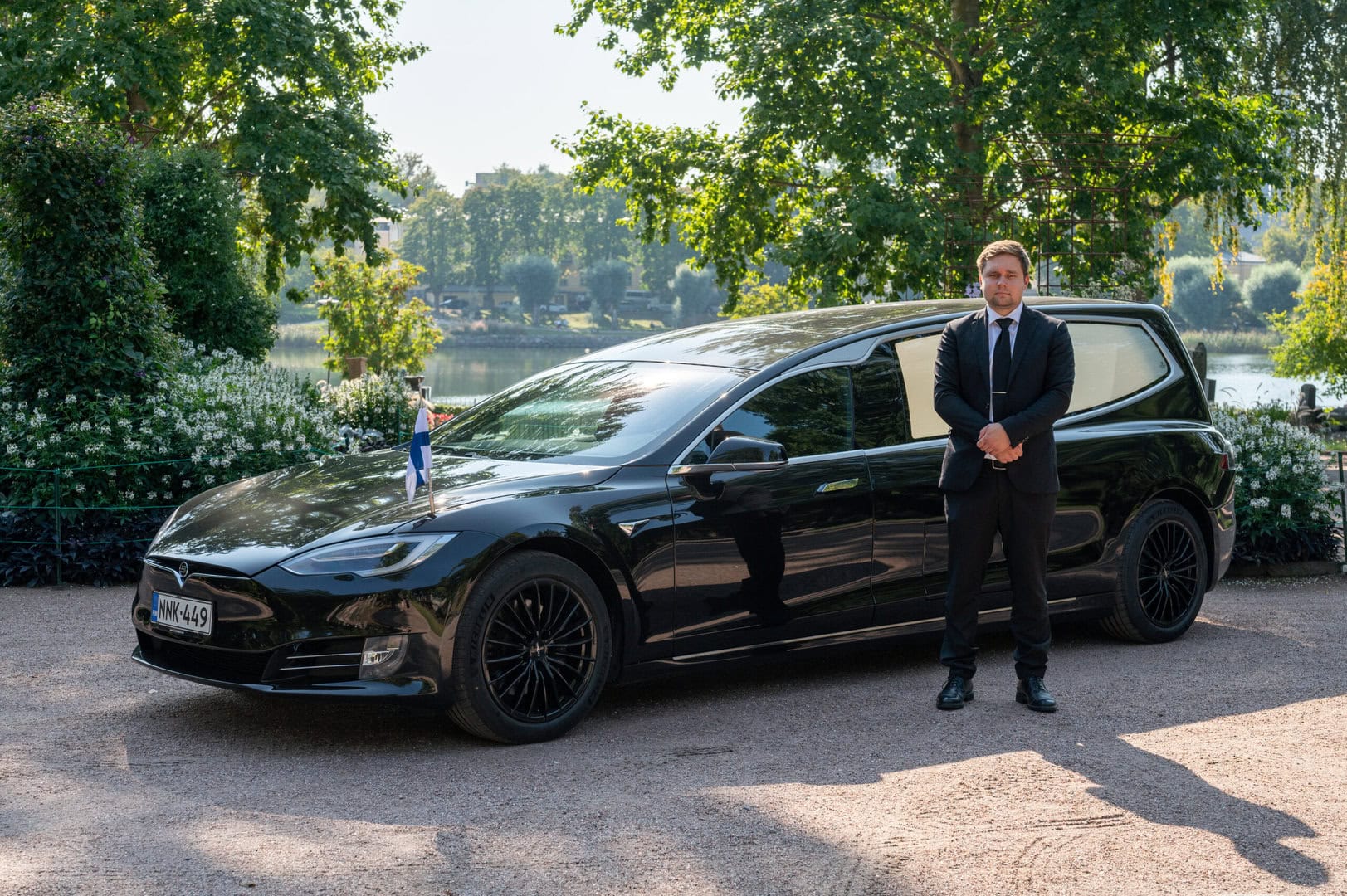 Odotusaika, auto ja hautausauton kuljettaja. Auto odottaa esimerkiksi Hindu-vainajan pesun ajan, 185 € /1 h.