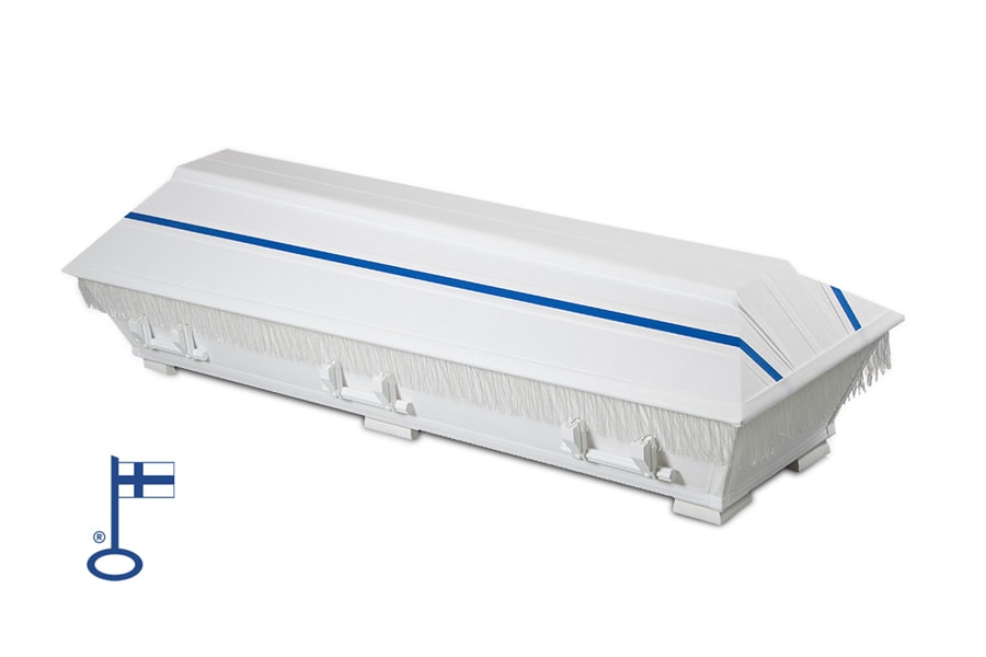 Hillityn tyylikäs arkku saattaa viimeiselle matkalle Suomen puhtaissa väreissä: merensineä vasten valkeaa. Siniset nauhat korostavat arkun linjakasta muotoilua. Pellavalla verhoiltu arkku on selkeä ja kaunis.